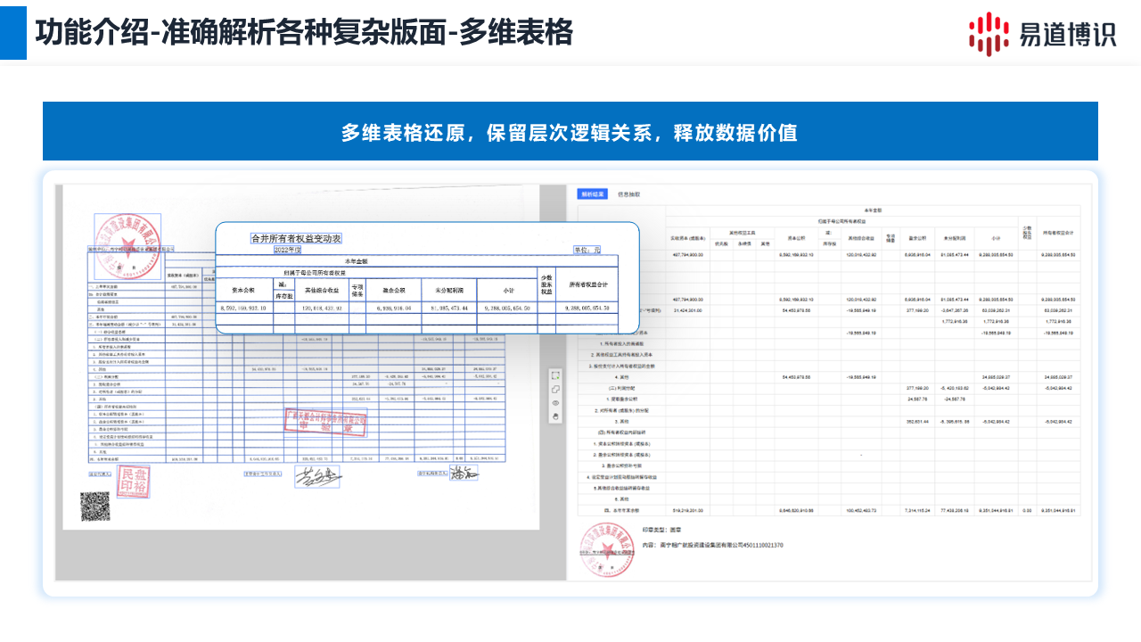 對于跨頁表格,系統具備自動檢測和拼接能力。它能識別出上百頁年報中跨頁表格的連續部分,并將其還原為一個邏輯完整的統一數據表,極大簡化了財務報表等文檔的數據處理。 對于多維復雜表格(如多級表頭、嵌套單元格),不僅能提取數據,更能解析和保留數據間的層級與隸屬關系。