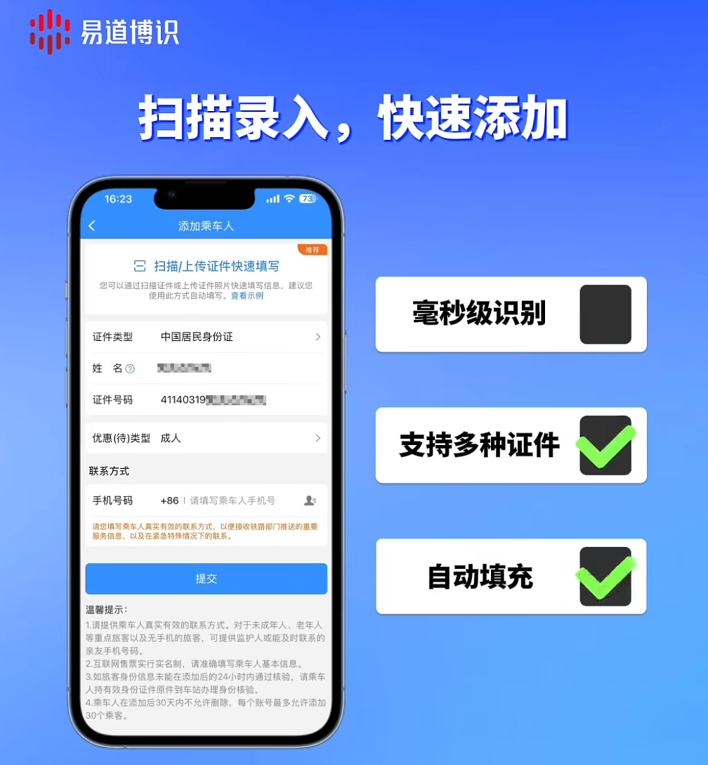 中國鐵路12306集成易道博識移動端識別SDK,針對“添加乘車人”這一高頻交互環(huán)節(jié)進(jìn)行了技術(shù)升級。通過OCR(光學(xué)字符識別)技術(shù),解決傳統(tǒng)手動錄入模式下的效率瓶頸與數(shù)據(jù)準(zhǔn)確性問題,實現(xiàn)從身份驗證到購票下單的數(shù)字化閉環(huán)。