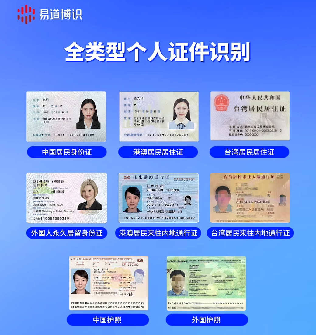 1. 支持二代證、護(hù)照及永居證等全類型證件的結(jié)構(gòu)化數(shù)據(jù)提取