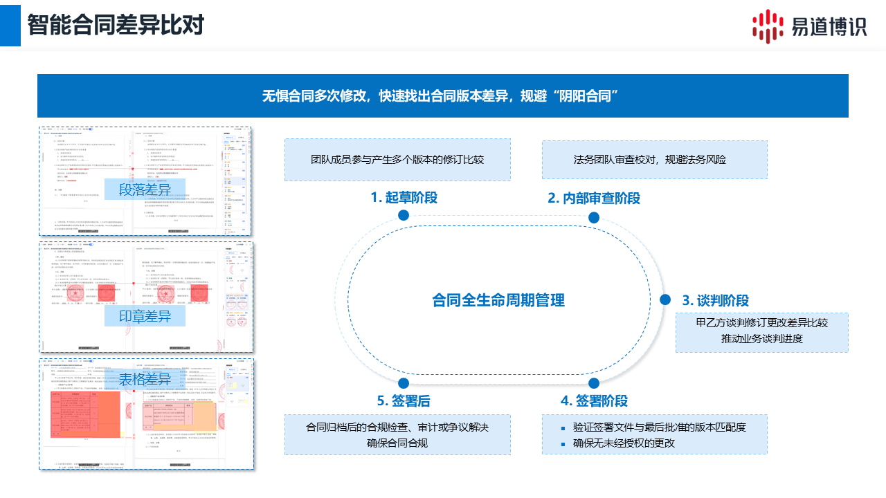易道博識系統(tǒng)將智能比對能力深度嵌入合同管理的每一個關(guān)鍵節(jié)點,實現(xiàn)對合同生命周期的全覆蓋: