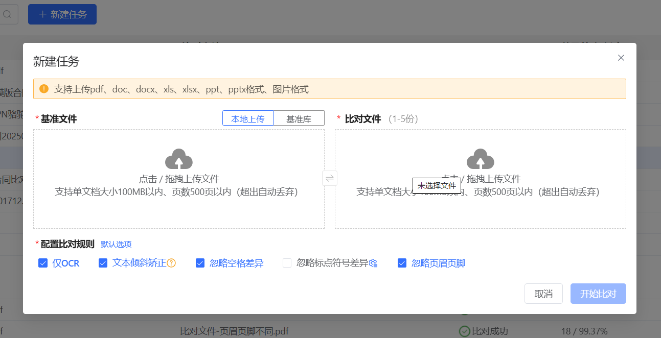 ●多文件交叉復(fù)核:支持創(chuàng)建“1對多”任務(wù),即一次性上傳1個基準(zhǔn)文件和最多5個比對文件進(jìn)行并行復(fù)核,極大提升了批量審核的效率。