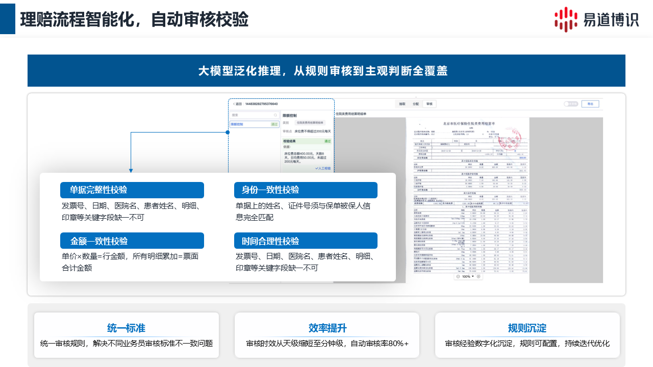 易道博識"AI+保險智能審核解決方案",依托智能文檔工作流DocFlux,大模型賦能理賠審核全鏈路,實現理賠材料自動分類及抽取、規則100%覆蓋。