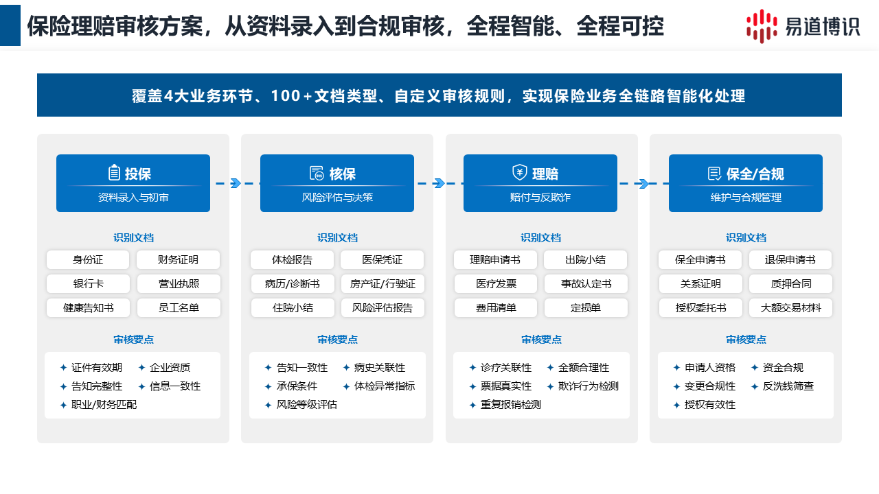 再看后端的業(yè)務(wù)審核。進(jìn)入核賠環(huán)節(jié)后,面對(duì)復(fù)雜的免賠額計(jì)算與自費(fèi)藥扣減政策,傳統(tǒng)模式依然依賴人工去逐條比對(duì)明細(xì)。一旦審核人員疲勞或判定標(biāo)準(zhǔn)不一,就極易引發(fā)錯(cuò)賠、漏賠以及相應(yīng)的合規(guī)隱患。